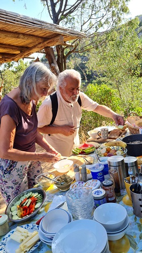 Es wurde viel gestaltet und gebaut – Haus mit Einliegerwohnung, Holzhütten, Caravans, allerlei Gemeinschaftsplätze: das große Meditationszelt, Tea Lounge und Bambusküche, Bäder, Duschen und WCS. Es gibt überall fließend Wasser und Strom, mehrere Gemüsegärten, und die Oliven, vor zwanzig Jahren als zarte Stecken gepflanzt, sind kraftvoll gewachsen.